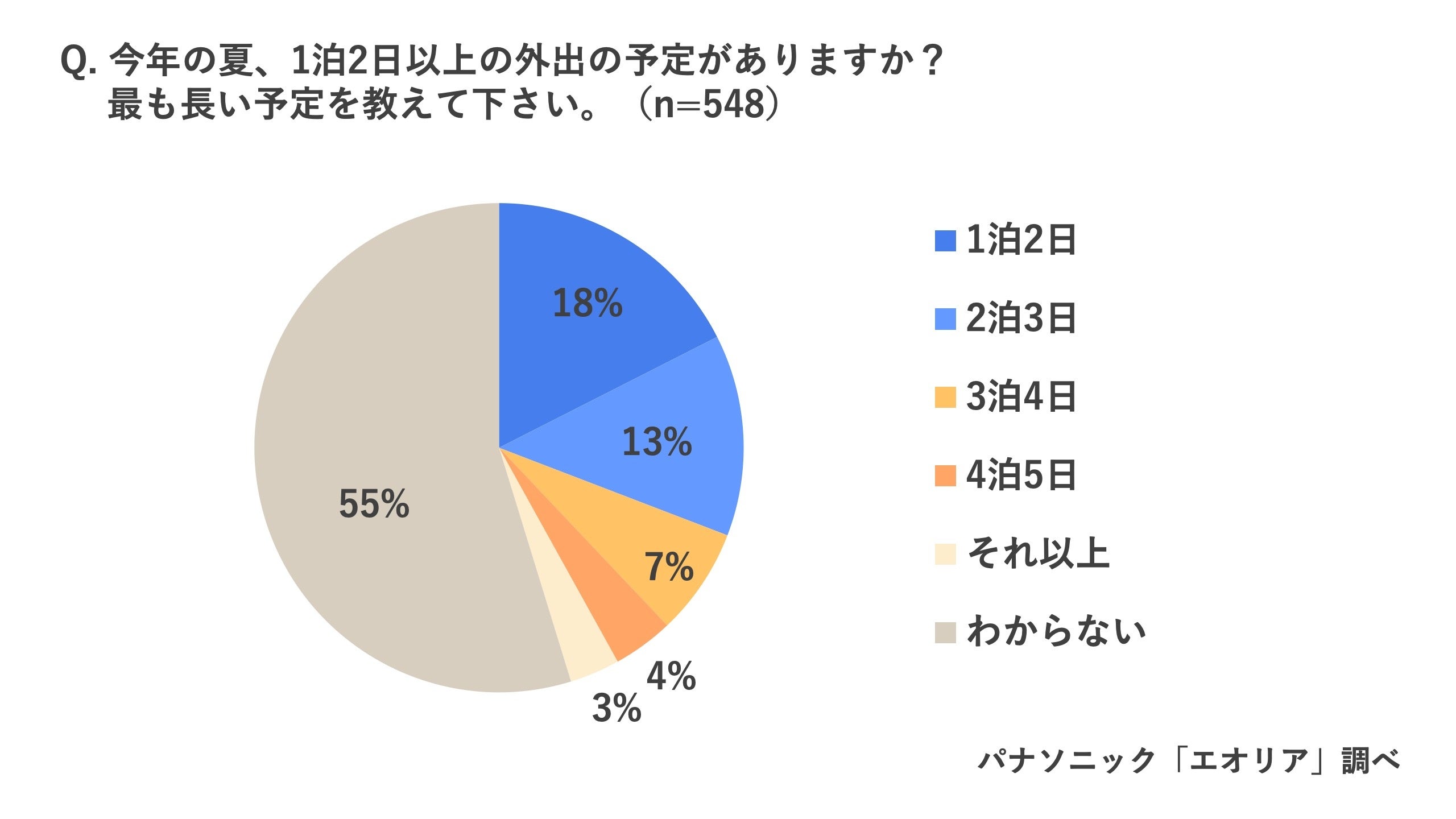 今年の夏、1泊2日以上の外出の予定があるかたずねたところ、外出予定のある方が45%と約半数の結果になりました。外出期間は「1泊2日」が18%で最多、「2泊3日」が13%、「3泊4日」が7%、「4泊5日」が4%と日数が短い順に割合が多くなりました。