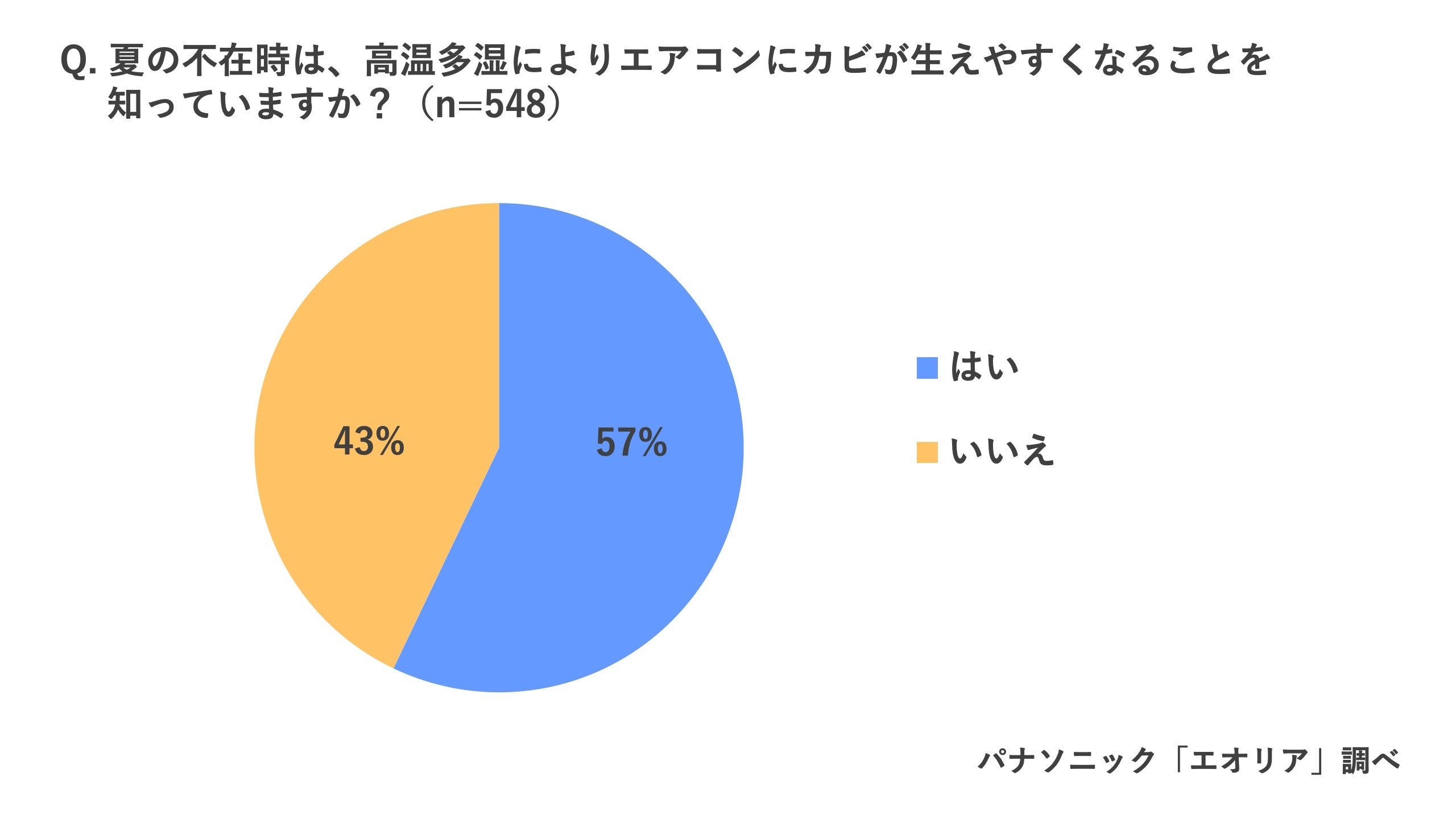 実は夏場の不在時は、部屋が高温多湿になり、エアコンにカビが生えやすい環境となります。さらに、エアコンをはじめとした屋内のカビの繁殖が、部屋のニオイの原因となることも。今回、「夏の不在時は、高温多湿によりエアコンにカビが生えやすくなることを知っていますか?」とたずねたところ、「はい」(57%)の一方で「いいえ」(43%)と、4割以上が理解していないことがわかりました。
