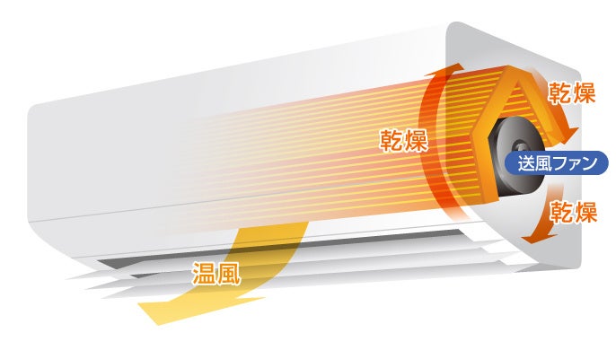 冷房や除湿運転を行うと、エアコン内部に結露が発生します。この水はドレンホースから外に出されますが、内部の湿度は高いままで、カビが発生しやすくなります。そこで「内部クリーン運転」でエアコン内部を乾燥させる必要があります。(すでに付着した汚れやカビを取り除く機能ではありません。)
