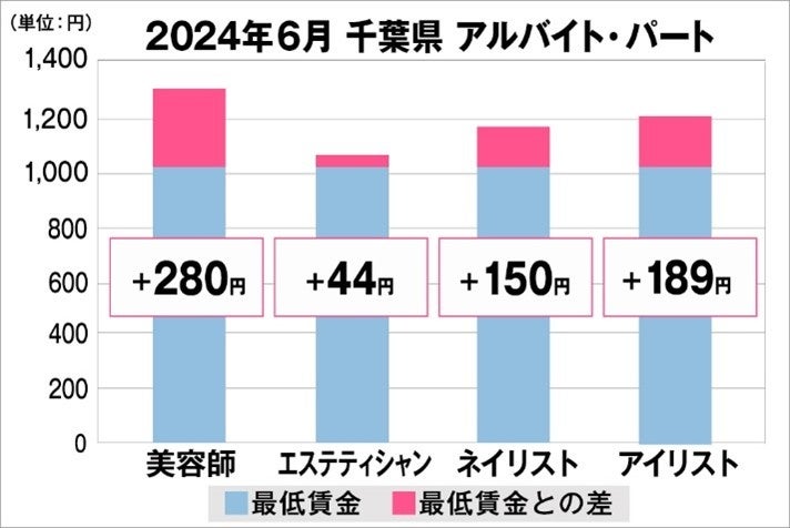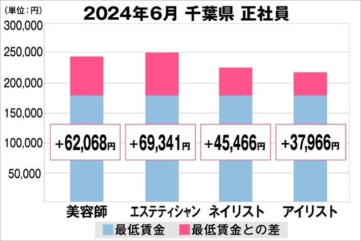 2024年6月時点で『美プロ』に掲載されている「千葉県」の「美容師・エステティシャン・ネイリスト・アイリスト」求人における「正社員」「アルバイト・パート」の給料を抽出。