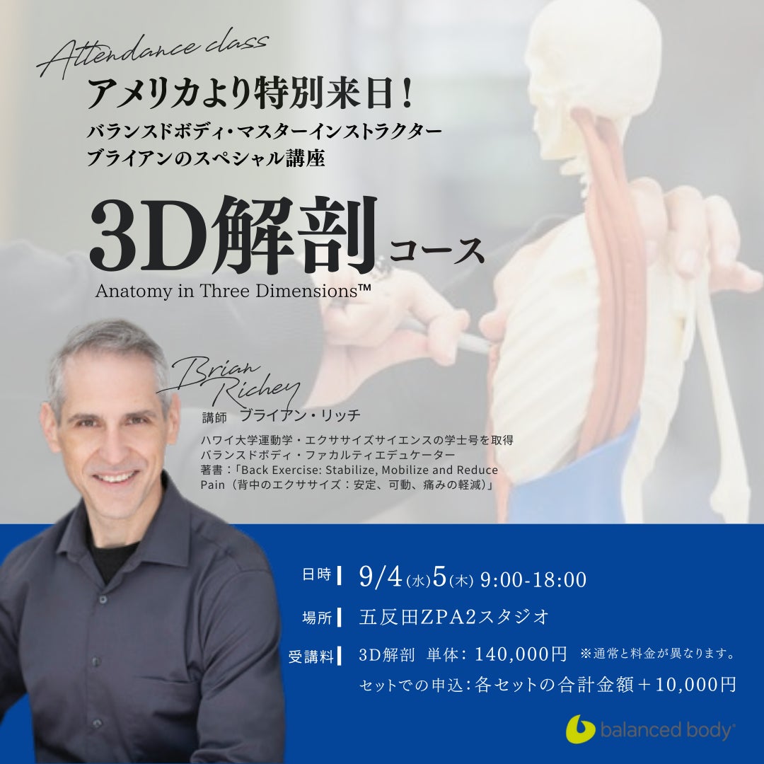 最先端研究結果・科学をもとに、グローバルな環境で最新技術とDXで挑戦を重ね、サービス業界にイノベーションを起こしている最先端のWeb3.0 DX企業であり、ウェルビーイング創造のリーディングカンパニーである株式会社ZEN PLACE(本社:東京都渋谷区 代表取締役:尾崎成彦)は、ピラティス・マシンとインストラクター育成の分野で世界最大の企業Balanced Body(R)のマスターティーチャー※1 Brian Richey (ブライアン・リッチー)氏を日本に招き、2024年9月4日 (水) ~5日(木) 東京にて、3D解剖特別コースを開催します。 (※1:インストラクター養成コースを担当する講師)