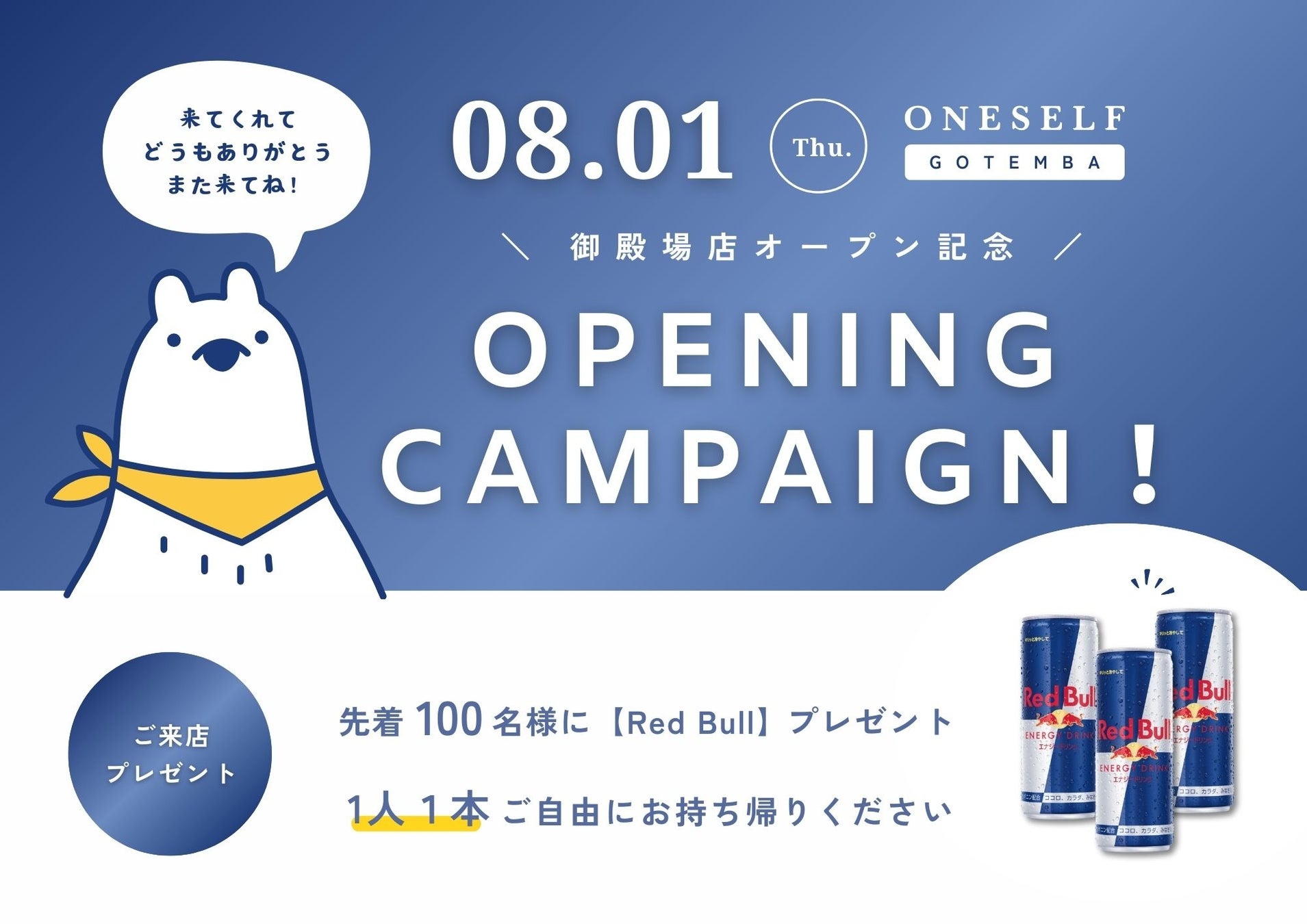 エナジードリンク「レッドブル」をお一人一本プレゼントしております。