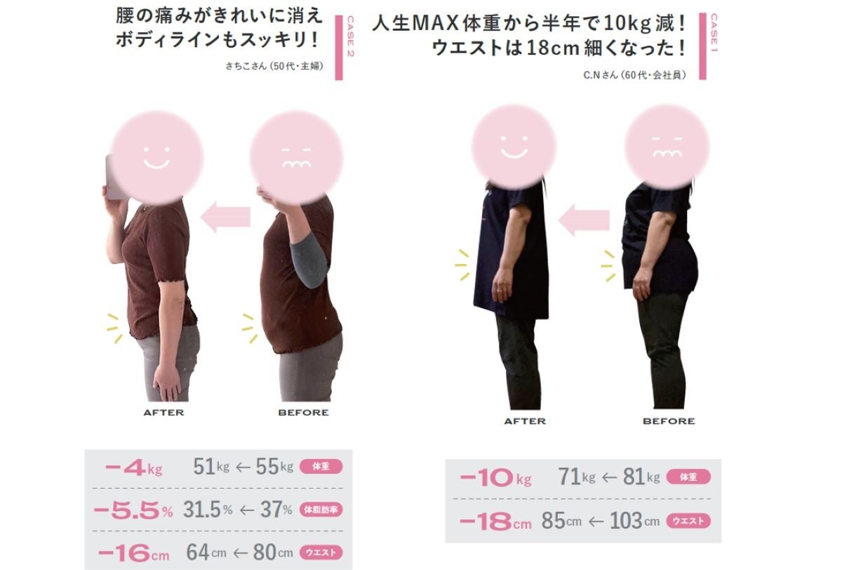 首や腰の痛みの改善を目的にはじめた結果、体重もウエストも大幅減! といった方も。