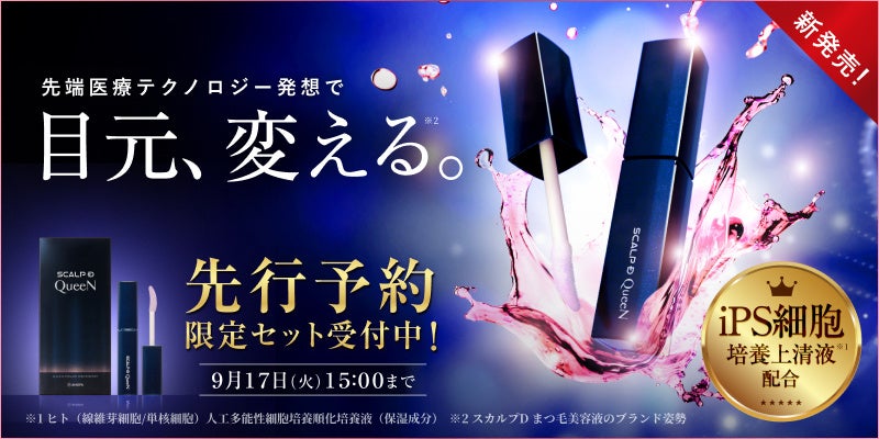 9月18日(水)の本発売開始に先駆け、「スカルプDまつ毛美容液 クイーン」の予約でシリーズ内対象商品のうち1商品が実質無料になる先行予約セットを、楽天市場限定で8月1日(木)10時から販売いたします。