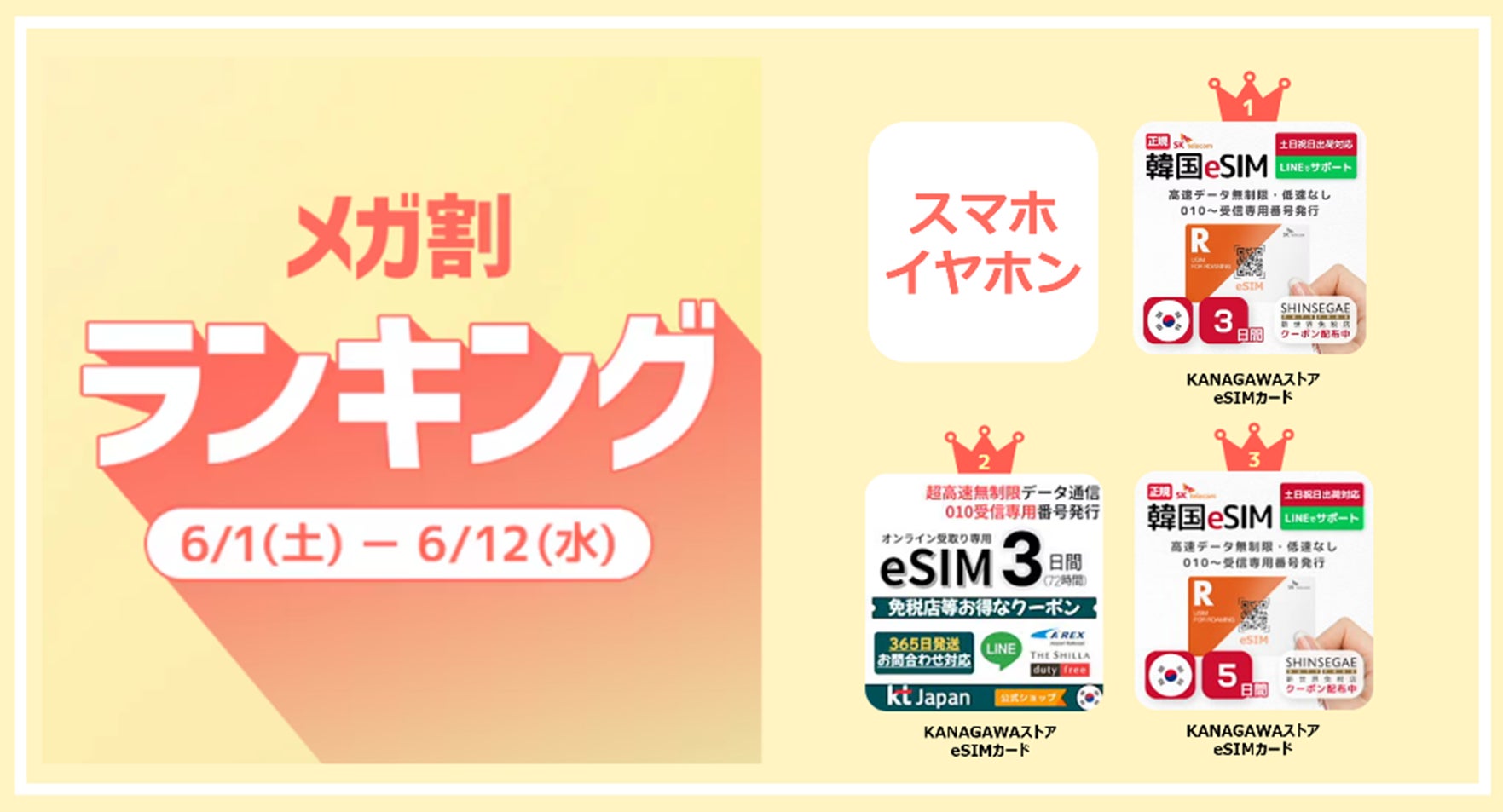 <スマホ・イヤホン>1位 韓国eSIM 3日間(KANAGAWAストア)