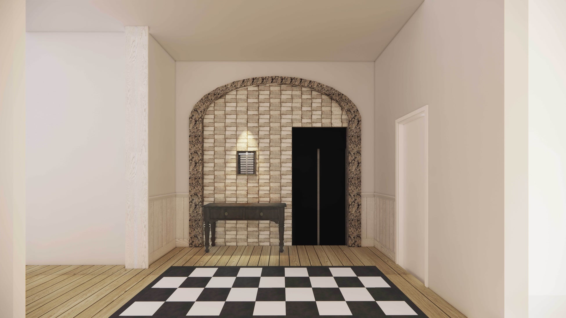 写真(左):新設された風除室は、広々とした空間でたくさんのお客様をお出迎えできるようにデザインしました。ヨーロッパのブティックホテルのような空気感の中でエレガンスを感じさせる風除室では訪れる全てのお客様を上質で温かい雰囲気でお出迎えいたします。