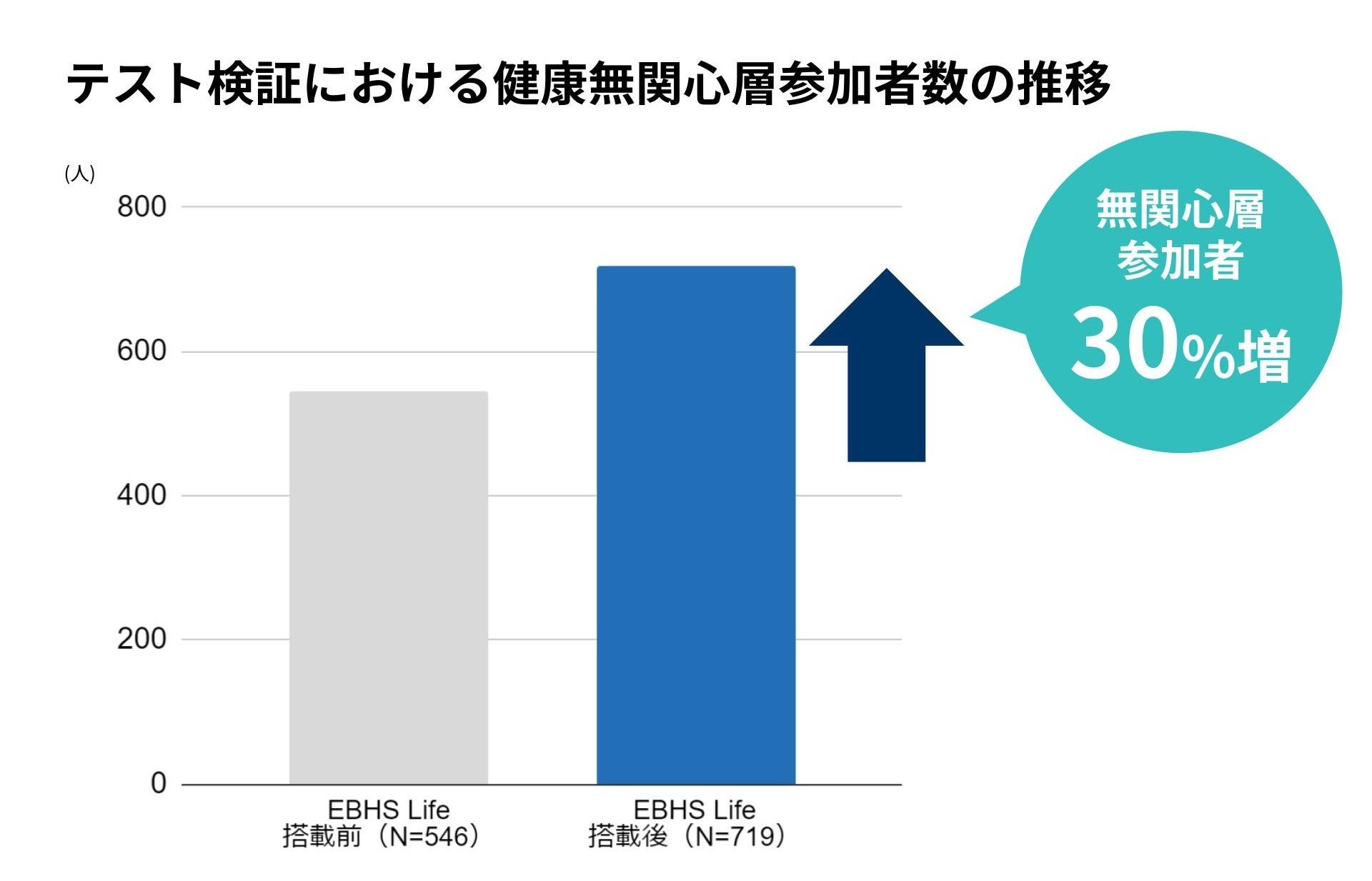 実際に富士通社内で約1,000名を対象に実施した効果検証では、「EBHS Life」の搭載により健康無関心層の申し込みを約3割増加させることに成功しました。更に、エムスリーがEBHS Lifeレポート利用者に対して独自に実施した利用者アンケート回答者の80%が、EBHS Lifeレポートを見て「生活習慣を改善しようと思った」と回答*しました。