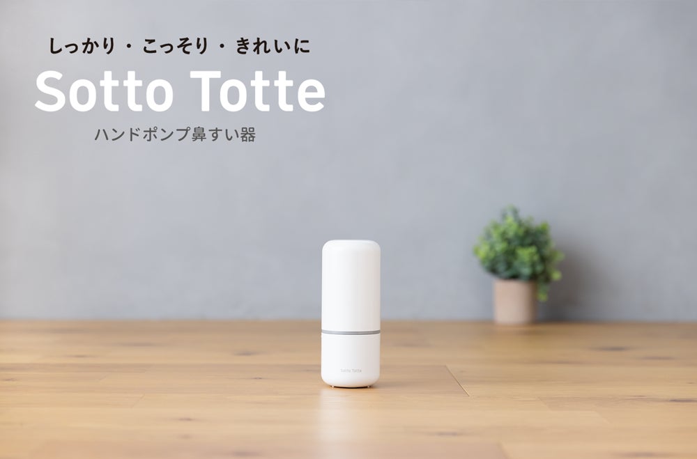 鼻づまりの赤ちゃんに苦しい思いをさせることなく、親子が安心で快適な時間を過ごすことができるように。『Sotto Totte(ソットトッテ)』は、パワフルな吸引力と静音性、収納など長年鼻すい器を発売してきた製薬会社のこだわりをふんだんにつめた鼻すい器ブランドです。このたび新たにハンドポンプ鼻すい器を新発売。全ての部品が収納でき、いつでもどこでもこっそり奥まで鼻水を吸うことができます。ベビー用品に見えないスタイリッシュなデザインで、おしゃれな生活空間やインテリアに自然になじみます。