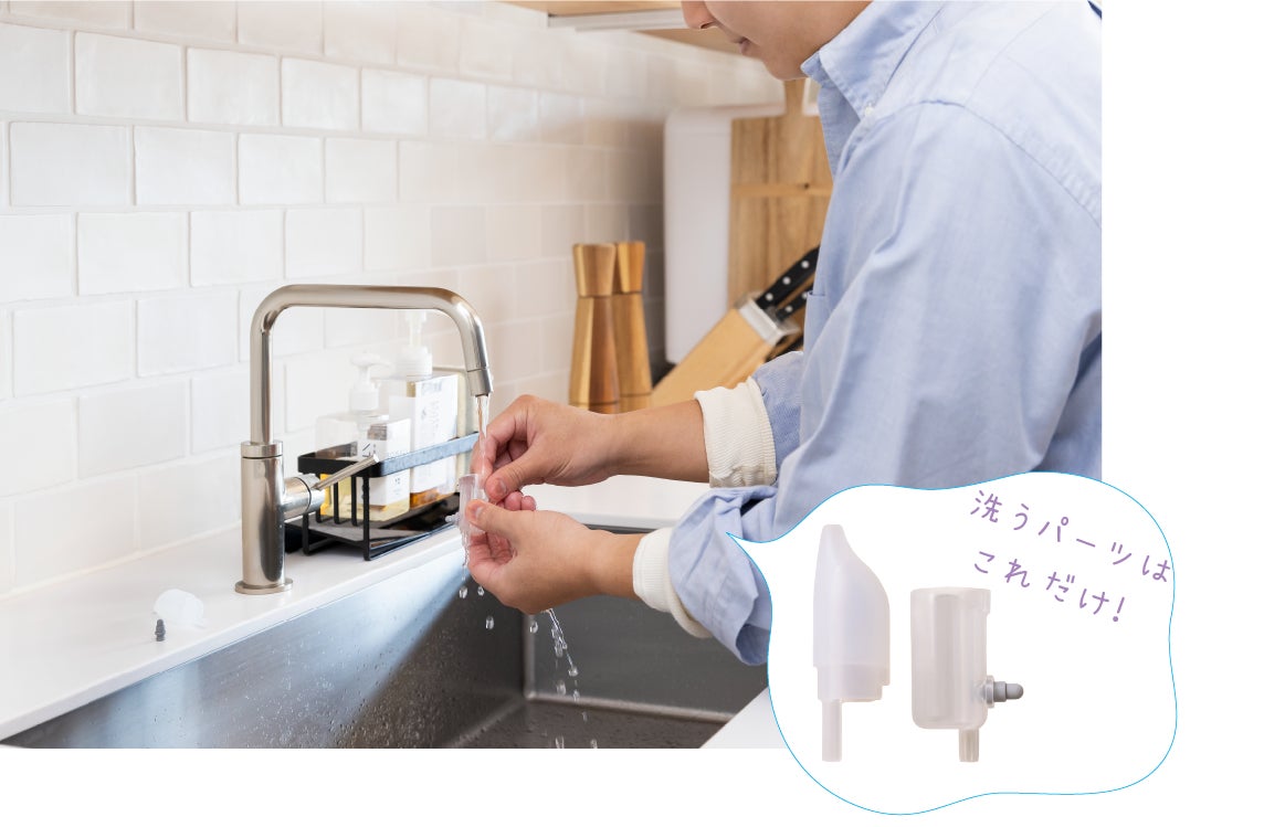 先端の鼻水タンクに鼻水が溜まるので、お手入れが面倒なチューブのお手入れは不要。洗うパーツが少なく、食器洗い乾燥機も使えてお手入れカンタンです。