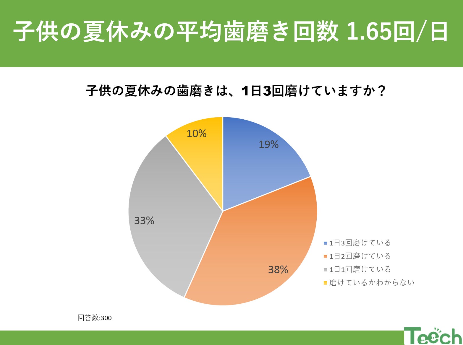 この結果から、夏休み中に子供たちがどの程度しっかりと歯を磨いているかがわかります。特に、一日一回しか磨いていない子供たちや、磨けているかわからないという母親の声が多く見受けられます。さらに、全体の平均では、子供たちは1.65回/日、歯を磨いていることがわかりました。