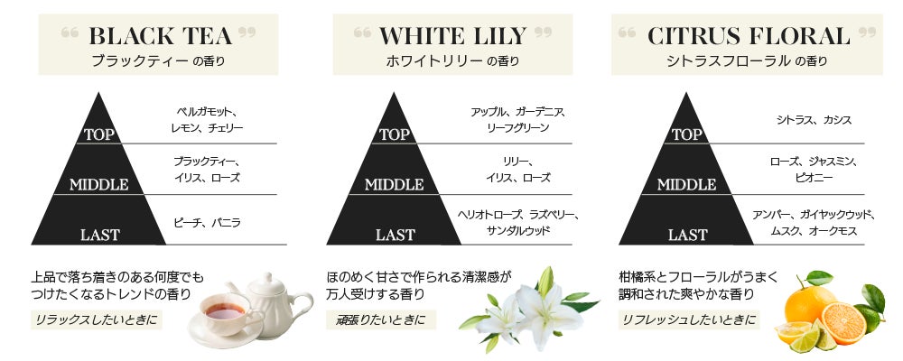 トップノートからラストノートまで厳選された香りのピラミッドがあなたを優しく抱きしめます。