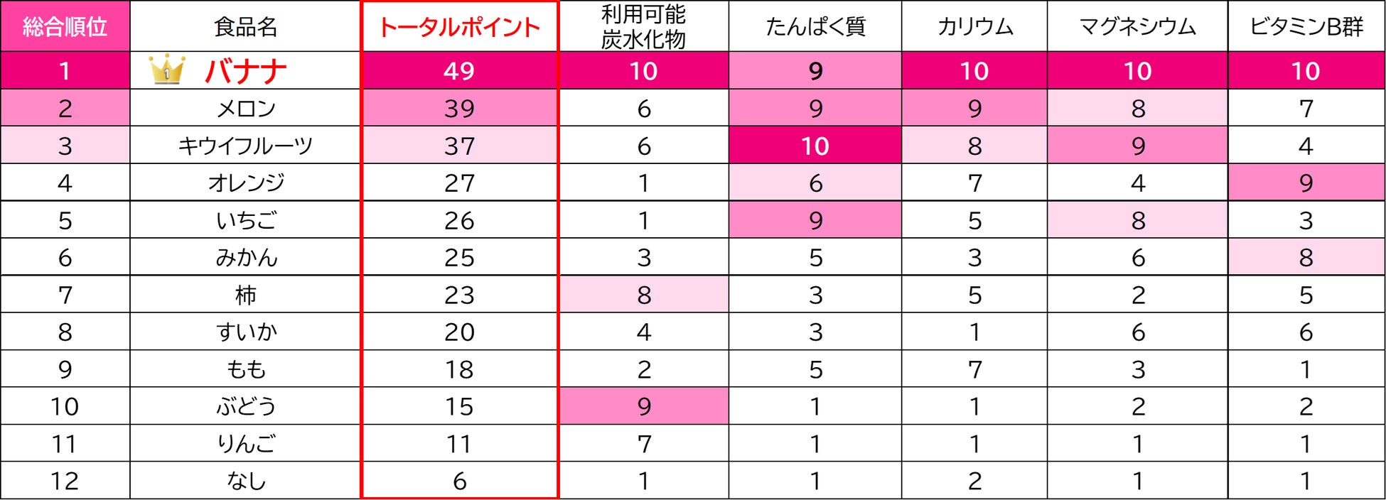 その結果、12品目のフルーツのうち「バナナ」がトータル49ポイントとなり、2位以下に10ポイントの差をつけてのトップとなりました。今回の調査で対象とした5栄養素のうち「たんぱく質」以外は全て1位(たんぱく質は同率2位)となる、堂々たる結果となりました。