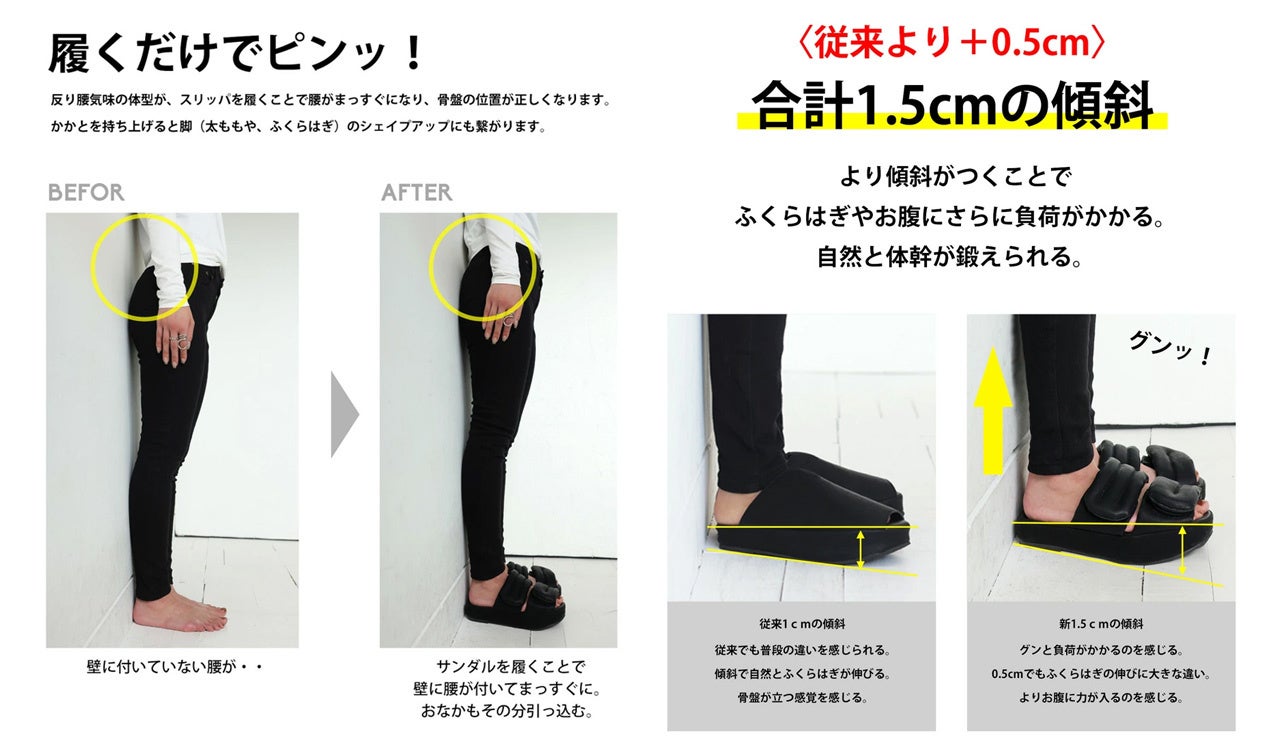 体感を意識させる1.5センチの傾斜ソールでカラダの重心が自然と後ろにシフト、下腹・ヒップ・ふくらはぎにきゅっと力が入り履くだけで姿勢矯正をしてくれるトレーニングサンダルです。