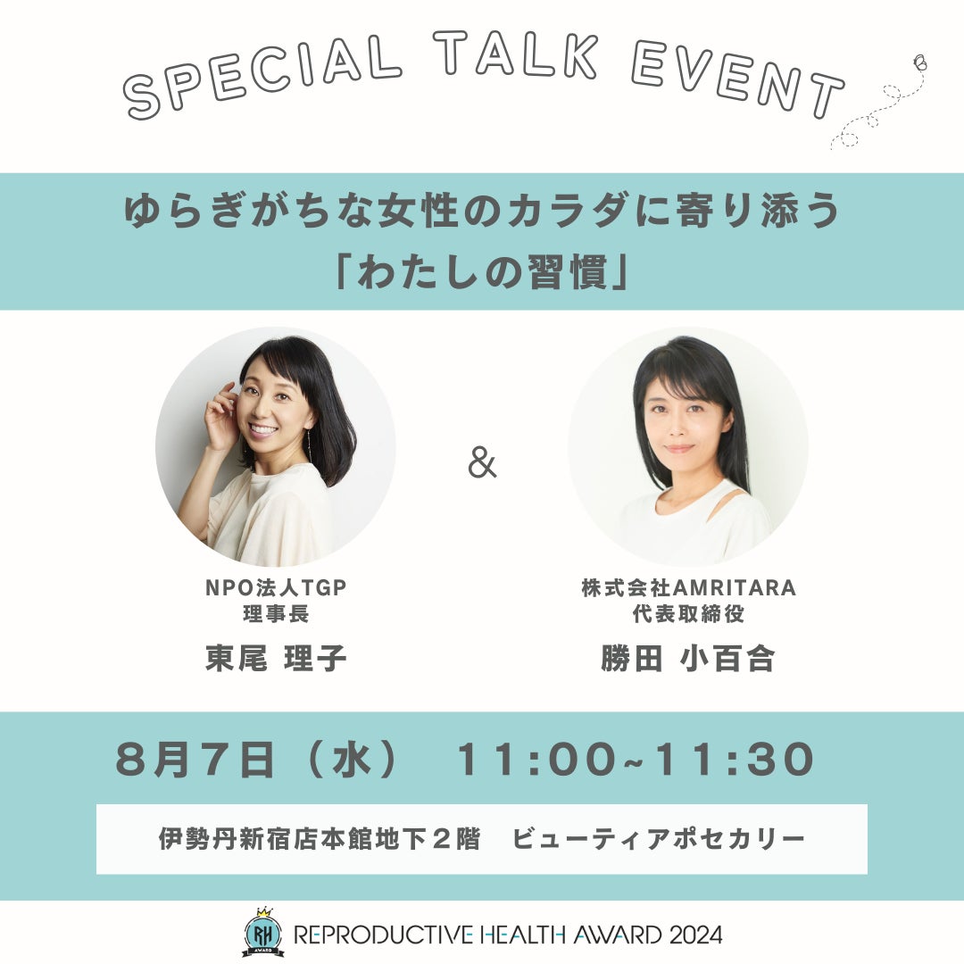 アムリターラ代表 勝田小百合氏と、NPO法人TGP理事長 東尾理子氏によるトークイベント。ゆらぎがちなカラダに寄り添うために、お二人が入っ
