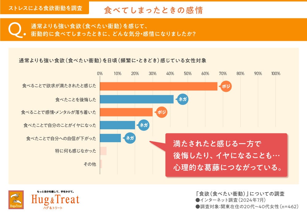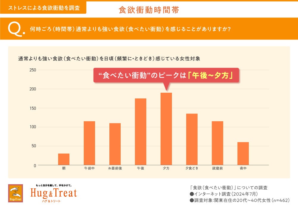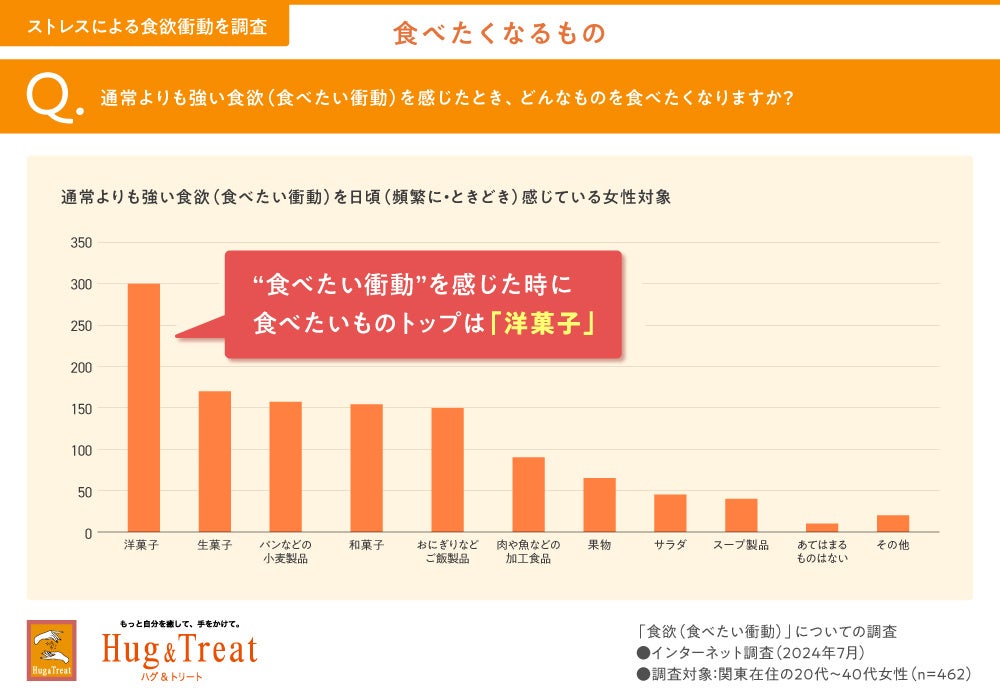 健康行動ブランド[Hug & Treat]を運営するニューロ・オン株式会社では2024年7月に「食欲に関するインターネット調査」を実施。女性のストレスや疲労による食欲衝動の実態についてレポートします。