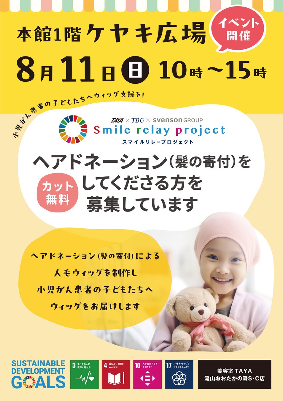 美容室TAYAを運営する株式会社田谷(本社:東京都渋谷区、代表取締役社長:中村隆昌、以下田谷)は、TBCグループ株式会社及び関連会社(本社:東京都新宿区、代表取締役:黛照男、以下TBC)並びに株式会社スヴェンソン(本社:東京都港区、代表取締役社長:児玉義則、以下スヴェンソン)とESG・SDGsを目的に発足した共同プロジェクト「スマイルリレープロジェクト」の一環として、2024年8月11日(日)流山おおたかの森S・Cにて、ヘアドネーション(髪の寄付)イベントを開催いたします。