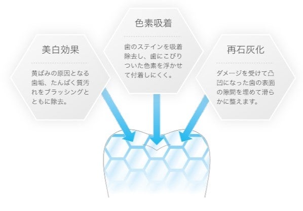 補修力を高めた超高圧*¹補修型*²ハイドロキシアパタイ*³が、着色汚れ、黄ばみを効果的に落としながら、再石灰化を促し、ツヤと輝きのある白い歯*⁵へ整えます。
