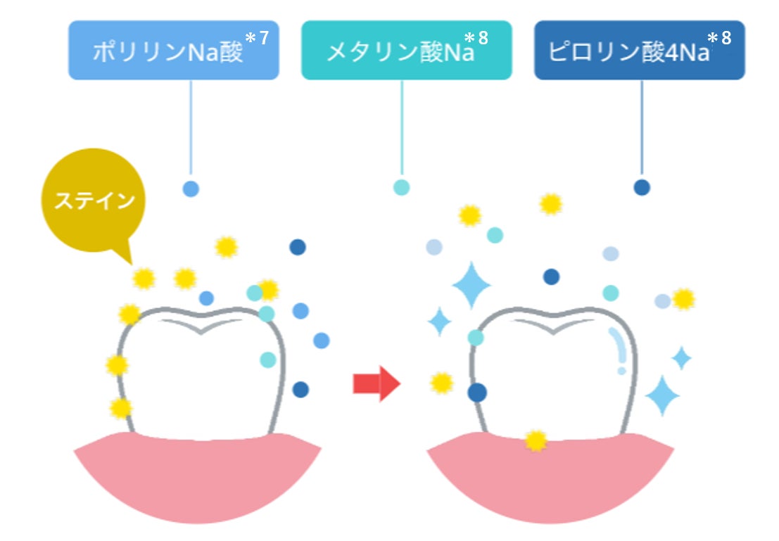 歯の黄ばみの原因の「ステイン」の再付着予防*⁶とケアを叶える3つのリン酸を配合。