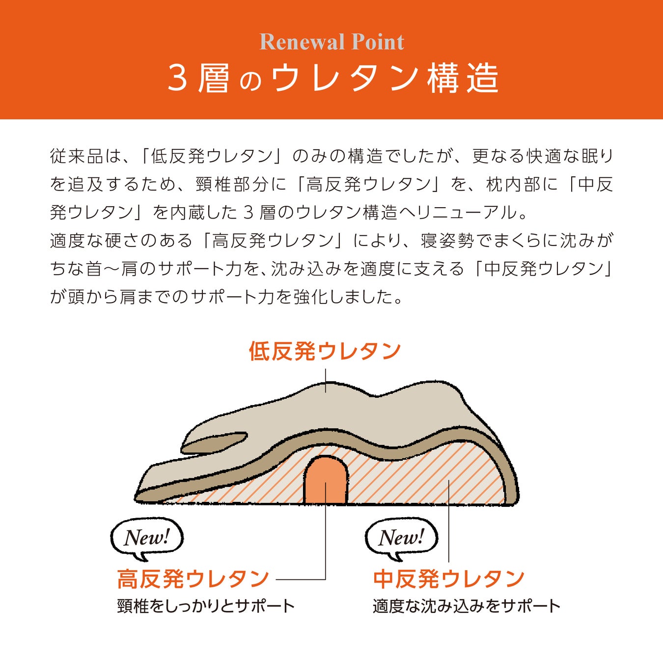 従来品は、「低反発ウレタン」のみの構造でしたが、更なる快適な眠りを追及するため、頚椎部分に「高反発ウレタン」を、枕内部に「中反発ウレタン」を内蔵した3層のウレタン構造へリニューアル。