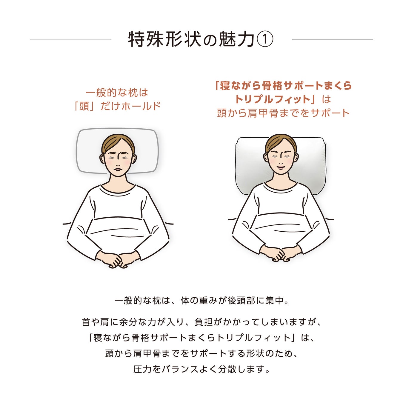 主力商品である「寝ながら骨格サポートまくら」シリーズは、2012年に初代がデビューして以来、これまでの販売歴が12年となるロングセラー商品であり、今回、『寝ながら骨格サポートまくらトリプルフィット』としてリニューアルいたしました。