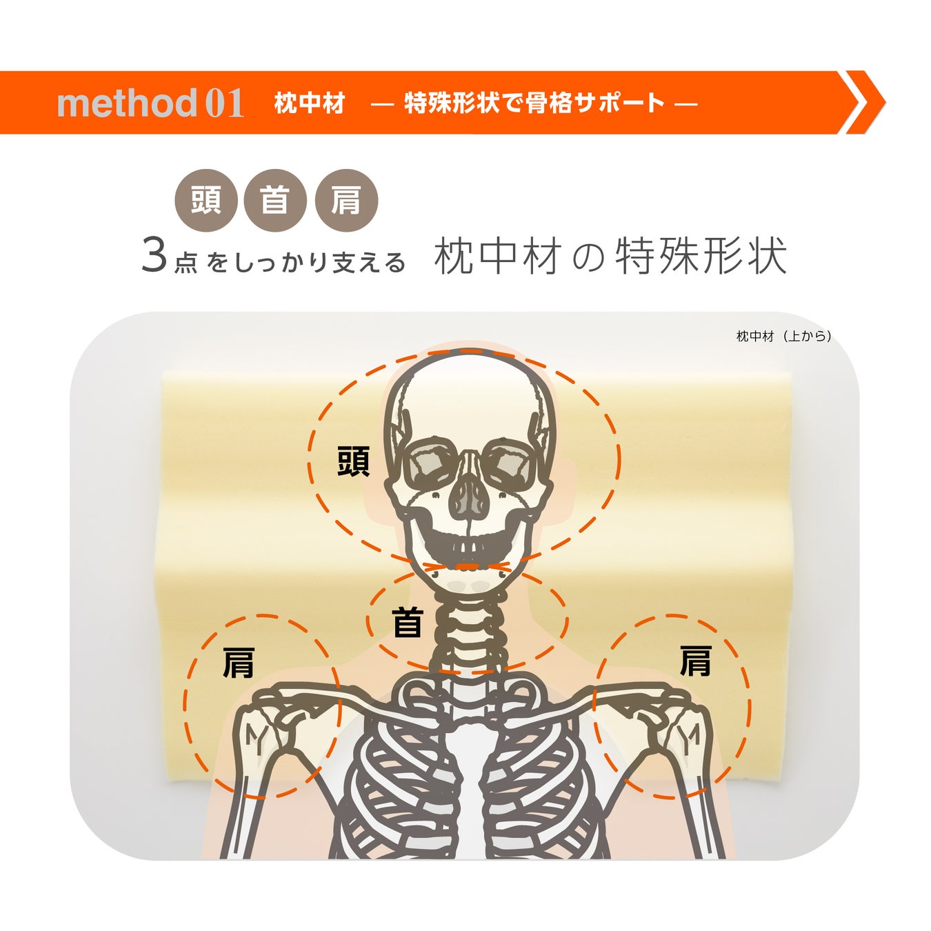 頭・首・肩の3点をしっかり支える枕中材の特殊形状