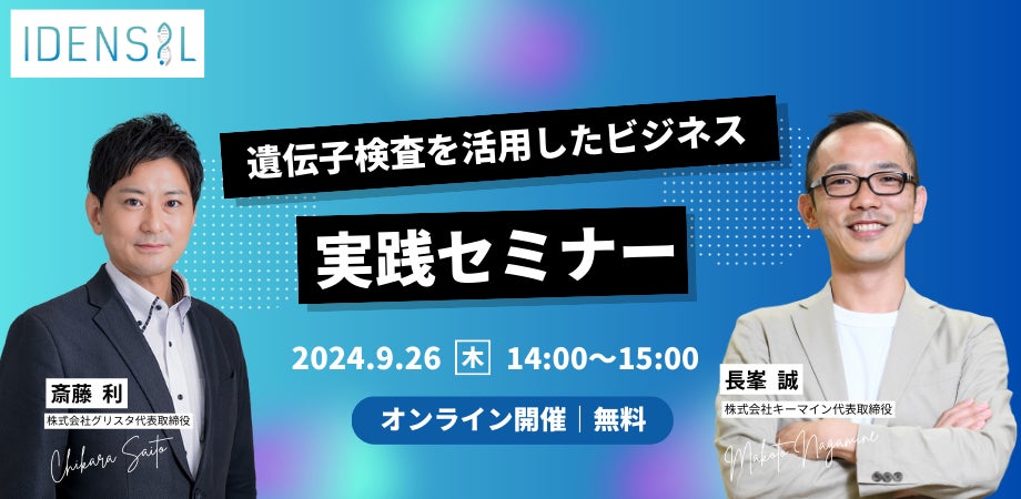 本セミナーでは、ゲストに多くのプロアスリートに遺伝子栄養プログラム「ユアプロ」を提供する、株式会社キーマインの代表取締役長峯誠様をお迎えし、どのように遺伝子栄養指導のパイオニアと呼ばれるまでになったのか、その経営戦略、政府や研究機関、大手シンクタンク等が提唱、推進しており、今ヘルスケア事業者に求められる“個別化ヘルスケア”について詳しくお話しをしていただきます。Google検索やChatGPTでは知ることのできない、遺伝子情報の活用にまつわる最新の生情報をキャッチできますので、ぜひこの機会にご参加くださいませ。