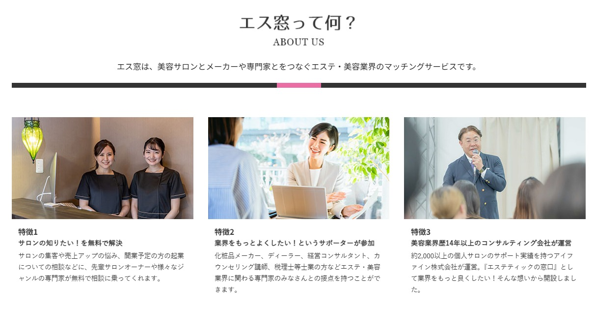 エス窓は、エステ・美容業界に特化したWebメディアで、サロン経営者の悩みを解決するためのビジネスマッチングサイトです。美容サロンと業界の専門家をつなぎ、集客や売上アップ、開業に関する相談が無料でできる環境を提供しています。アイファイン株式会社が運営し、豊富なサポート実績を持ち、業界の発展を支援することを目的としています。サロン同士の交流も促進し、ネットワークを広げる場としても機能しています。