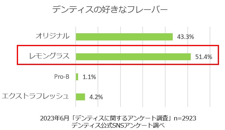 デンティス公式SNSで行ったアンケートではオリジナルフレーバーをおさえ、レモングラスが1番人気という結果となりました。「家族で使っている」「辛さ控えめなのに爽やか」「香りが好き」など、老若男女問わず愛されるフレーバーです。