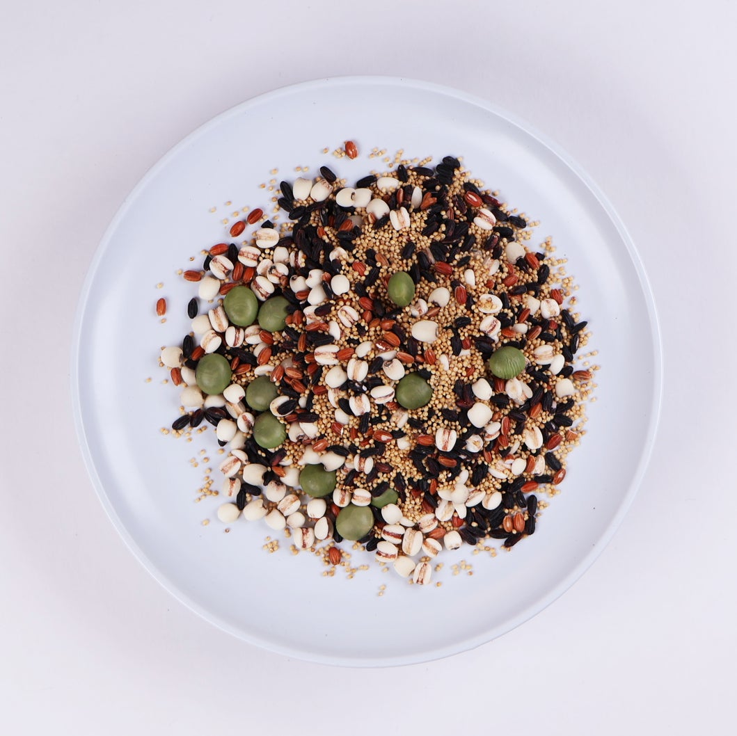 15種類の雑穀から5つの雑穀を組み合わせたオリジナル雑穀米をつくることができます。雑穀にはそれぞれ特性があるので、美容、運動不足、健康、食生活、メンタル不調など様々な目的に合った雑穀米をつくることが可能です。