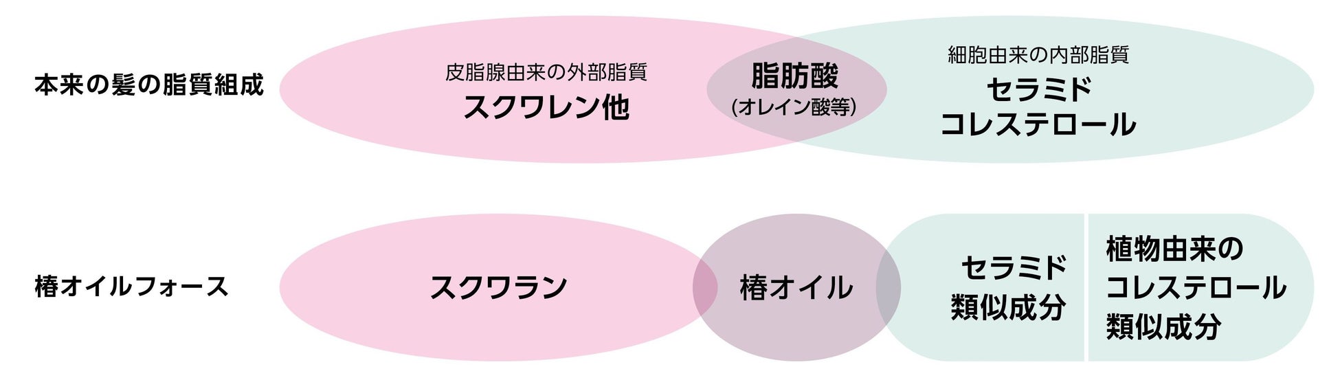 毛髪内外の脂質を構成する組成に限りなく近づけるため、髪の主要な脂質であるオレイン酸を多く含む椿オイル※2に、スクワラン、セラミド、コレステロール類似物質をブレンドした成分=“椿オイルフォース※3“を各商品に配合