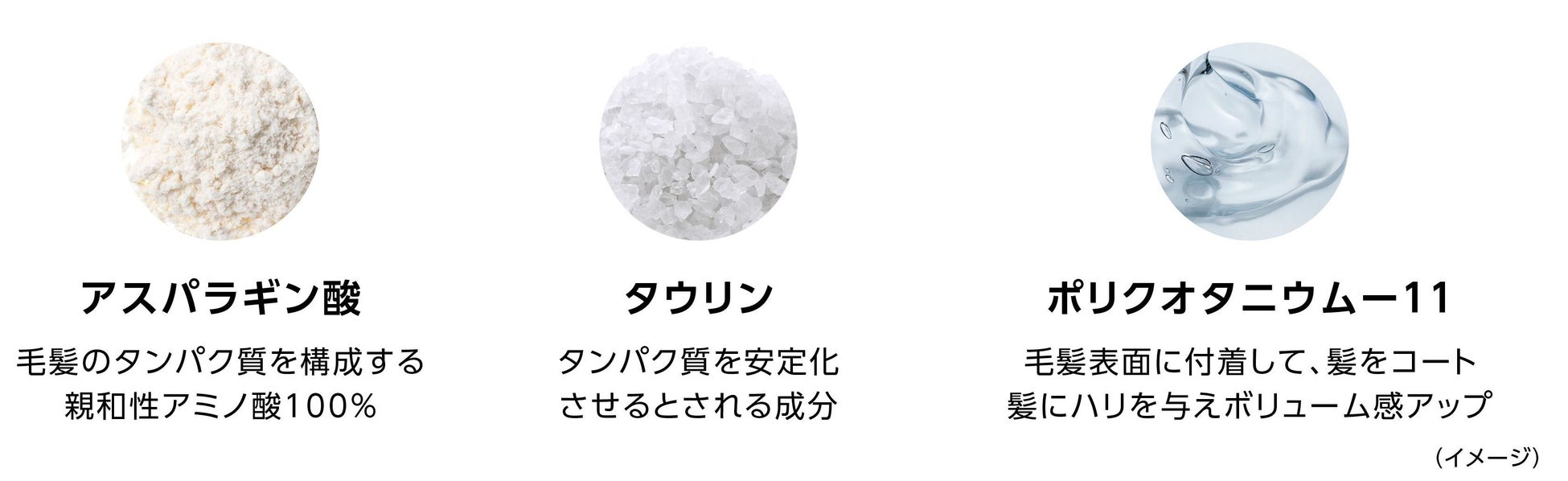 アミノ酸である「アスパラギン酸」を毛髪に補給しながら、タンパク質を安定させるとされる「タウリン」、毛髪表面をコートする「ポリクオタニウム-11」からなるボリュームリッチコンプレックスが毛髪にハリコシを与え、ふんわりボリュームのある髪へ