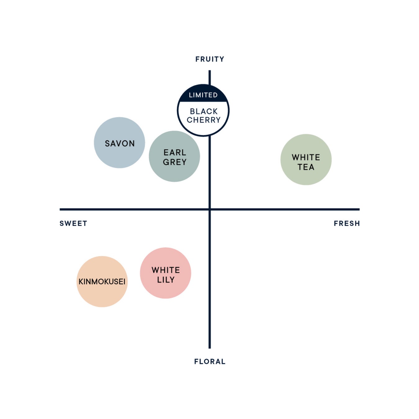 第1弾となる今回は、みずみずしく甘酸っぱいフルーツと、優雅なフローラルが香る、新作フレグランス「ブラックチェリー」が数量限定で登場。カシスやピーチ、プラムやストロベリーなど、甘酸っぱいフルーツたちを集めたトップノートにはじまり、ジャスミン、ローズ、ハニーサックルからなる、優雅な花々が香るミドルノートへ。そして最後には、アンバー、ムスク、ウッディの落ち着きある甘さが漂います。