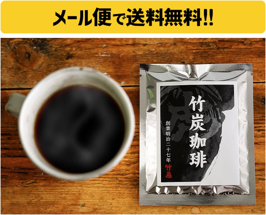 竹炭珈琲のメール便送料無料サービスを開始!一回の注文につき1点まで送料無料、ポスト投函のため受け取りが不要です。無味無臭の最高級竹炭パウダー使用でドリップバッグ式なので手軽に本格コーヒーが楽しめます。