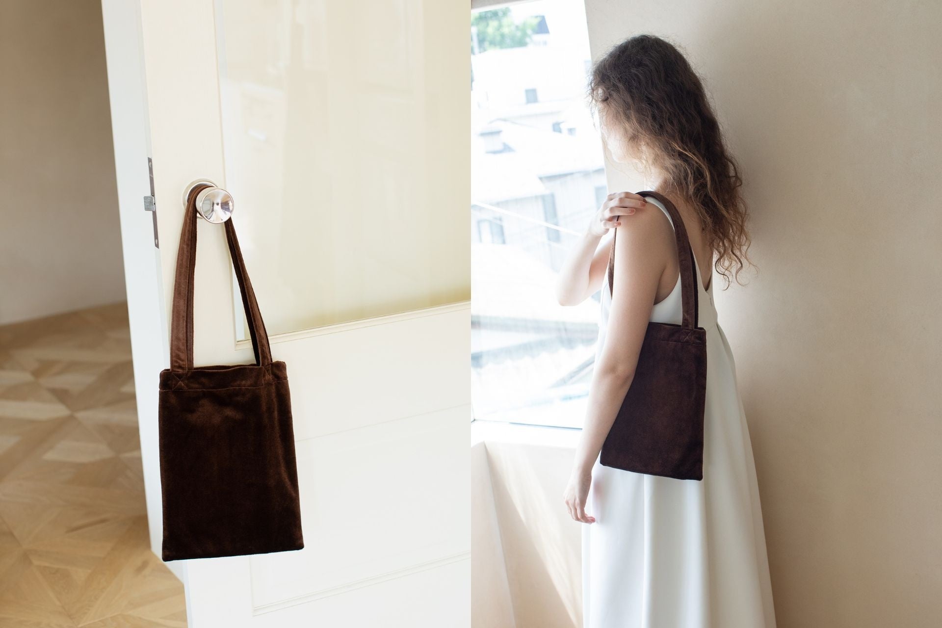 ベロア素材のコンパクトなトートバッグ。持ち手を少し長めにすることで、肩にかけやすくしました。内ポケット付きでiPadも入るA4サイズなので、持ち歩きに便利なデザインです。