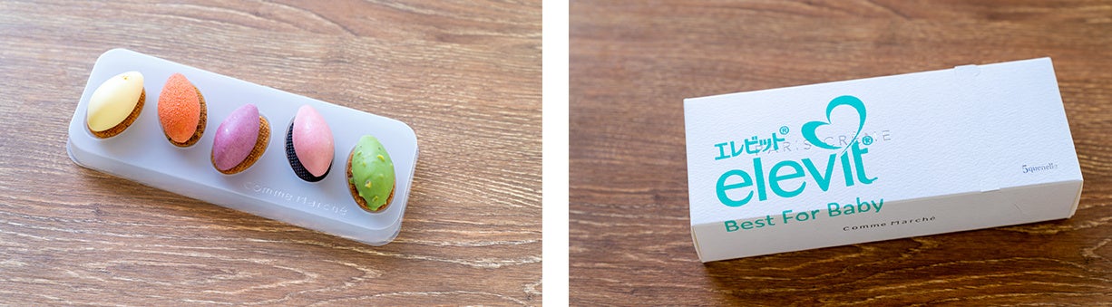 今回福岡市博多区の「Restaurant Sola」、油山の「Sola ABURAYAMA」のお店をかまえるSola Factoryさんにスイーツをご提供頂きました。パリ開業1年半でミシュラン1つ星を獲得したお店ならではのオシャレなスイーツで、「エレビット® 産後ケア」のブランドカラーを基調にしたクリームがチョコにコーティングされ、左からバニラ、ラズベリー、ブルーベリー、ストロベリー、ピスタチオ味となっています。
