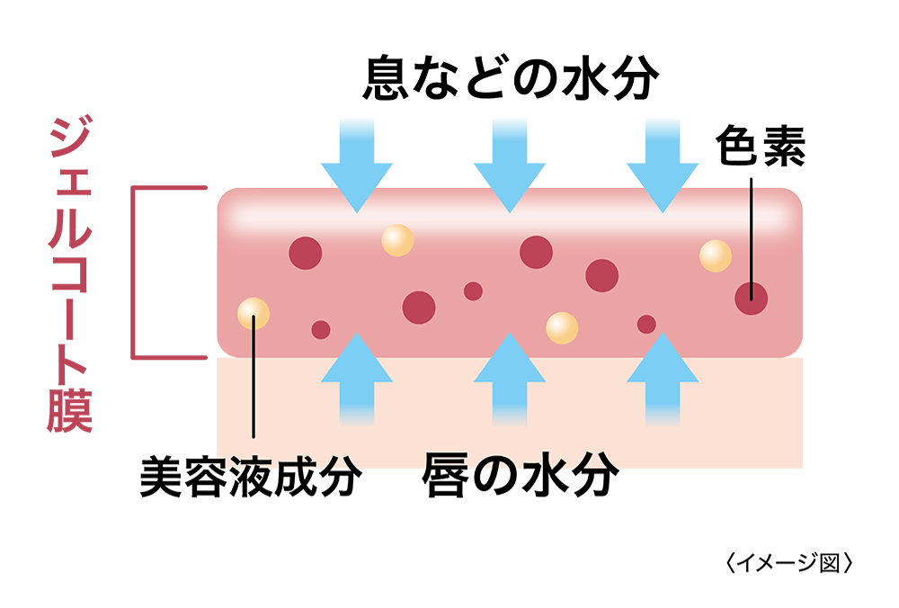 塗ってしばらくすると、唇や息の水分と反応して色素を取り込んだジェルコート膜を形成。色・ツヤ・うるおいをキープします!