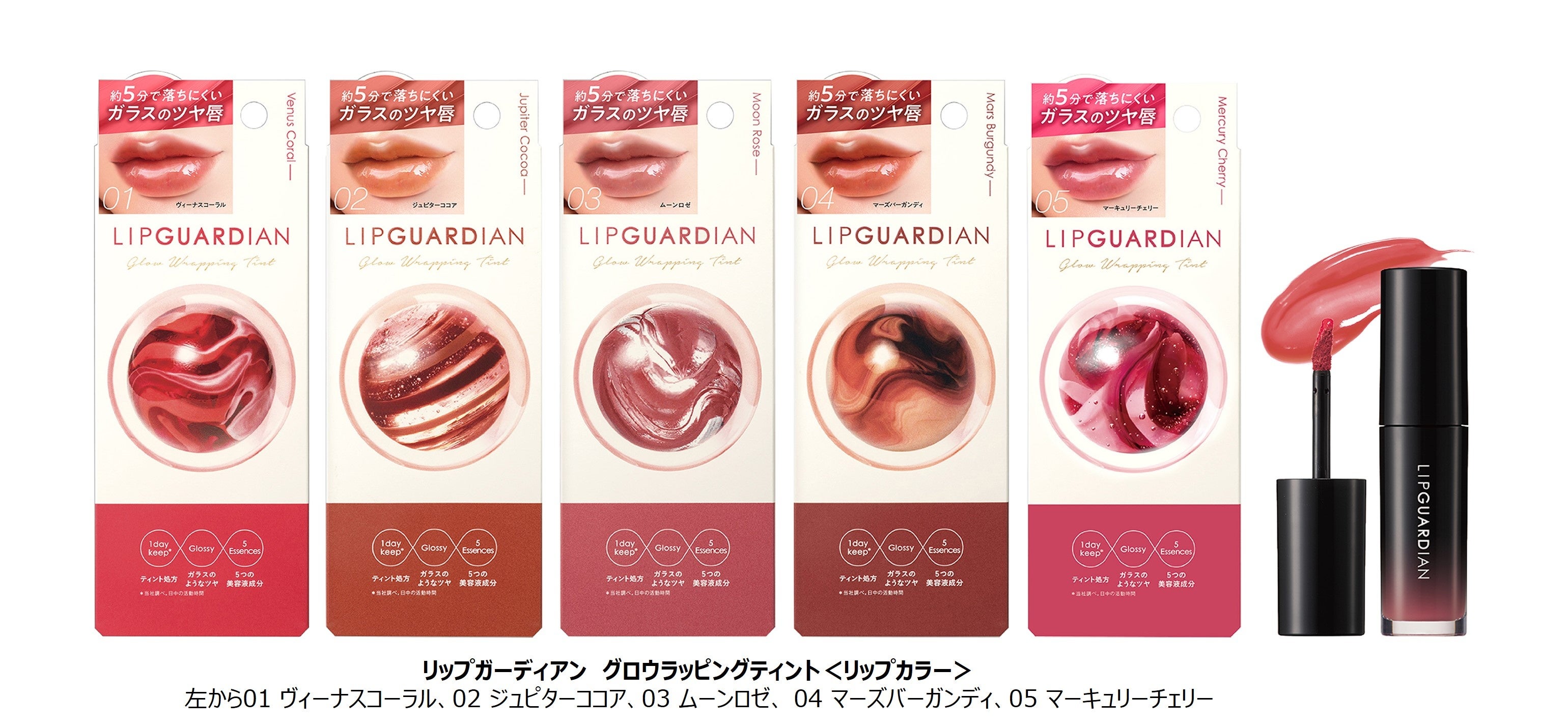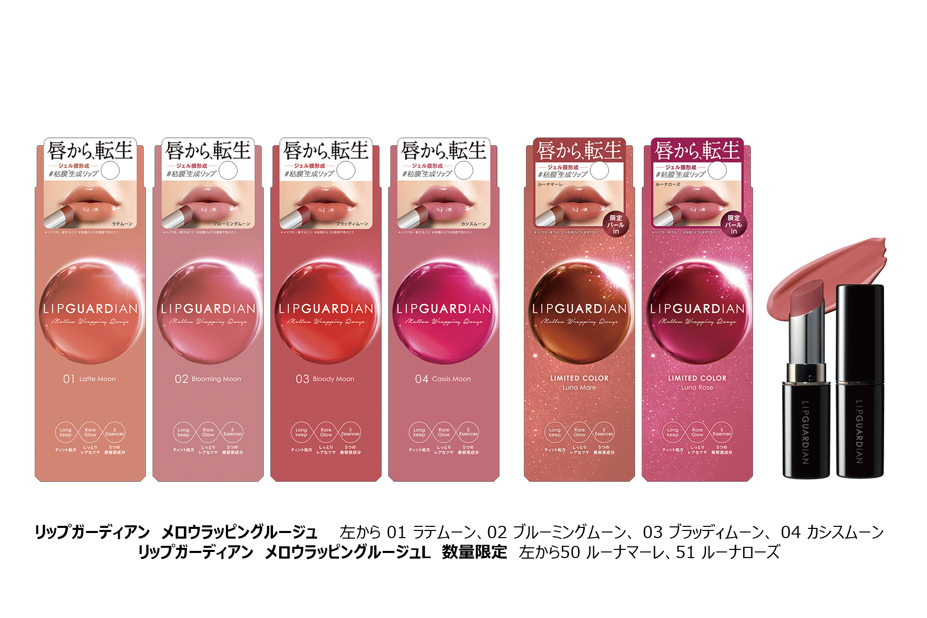塗ってしばらくすると、唇や息の水分と反応して色素を取り込んだジェルコート膜を形成。色・ツヤ・うるおいをキープし、つけたての仕上がりを守ります。カラーラインナップは、リアルな血色感カラーと粘膜のようなツヤを与える定番4色、限定2色。「リップガーディアン メロウラッピングルージュ」で ” 唇から、転生※1 ”をぜひ、ご体感ください。