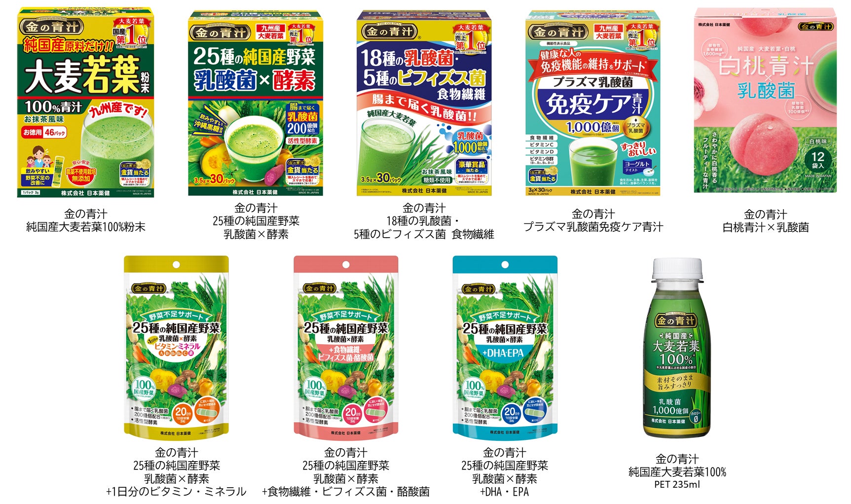 日本薬健は、今後も「金の青汁 18種の乳酸菌・5種のビフィズス菌 食物繊維」をはじめ、お客様に寄り添い、毎日の健康をサポートする商品開発に取り組んでまいります。