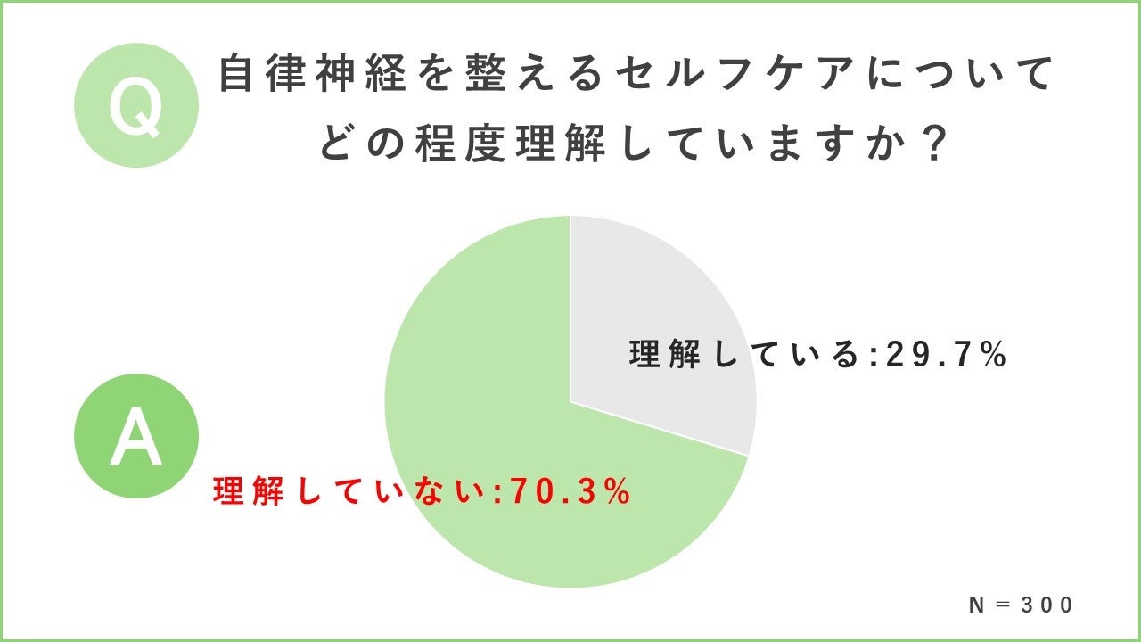 夏の体調不良、いわゆる夏バテの原因には、屋内外の気温差、強烈な紫外線などによる自律神経の乱れが影響しています。自律神経は呼吸、消化などの基本的な生命活動を維持する機能を担っており、先述のような外部からの刺激を受けると自律神経の働きが乱れ、心身の不調として症状に表れます。 そんな自律神経を整えるための方法について、アンケート調査※2を実施したところ、自律神経を整えるための効果的なセルフケアを「知っている」と回答した割合は約3割と、心身の不調を根本から対策・予防する方法について理解度が低いという実態が明らかになりました。自律神経を整えるためのセルフケアには、良質な睡眠や適度な運動、リラックス効果のある入浴や香りを日常生活に取り入れることなどが挙げられますが、腸活もセルフケアとして効果に期待することができます。
