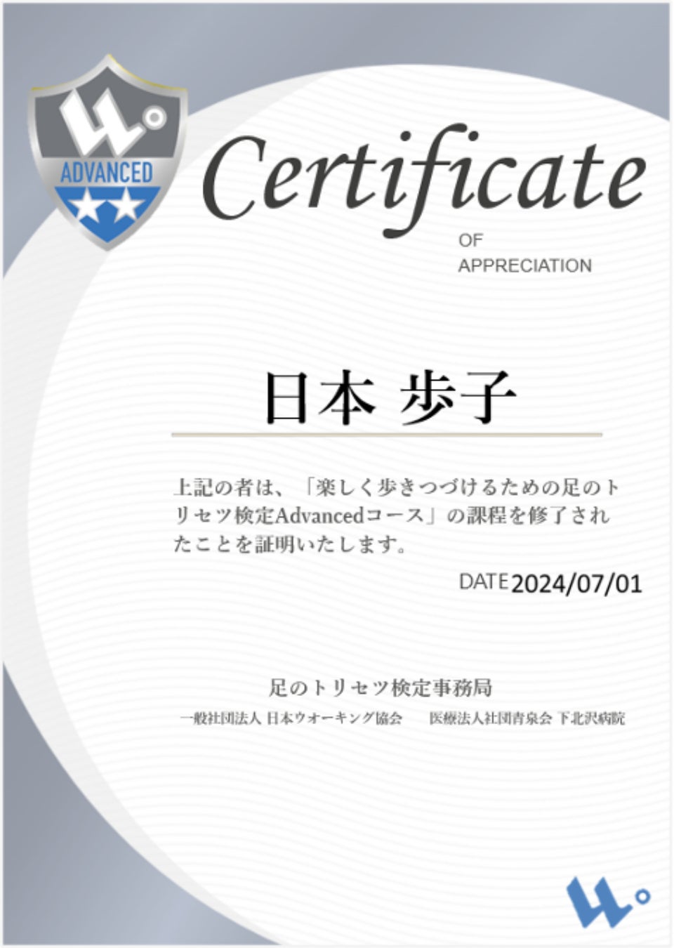 2024年8月1日より、「足のトリセツ検定」アドバンスコースの検定試験申し込み受付を開始します。「足のトリセツ検定」は、足の専門医とウォーキングのスペシャリストによる日本初の検定プログラムで、ベーシックコースに続き、さらに深い知識を身に付けたい方、”歩く力”を落とさずいつまでも健康に過ごしたい方におすすめです。