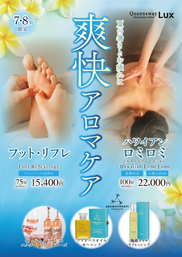 Queenswayのハイクラスサロンという位置づけであるQueenswayLUXが「爽快アロマケア」と題しまして7月から継続してお得なコースをご提供いたします。