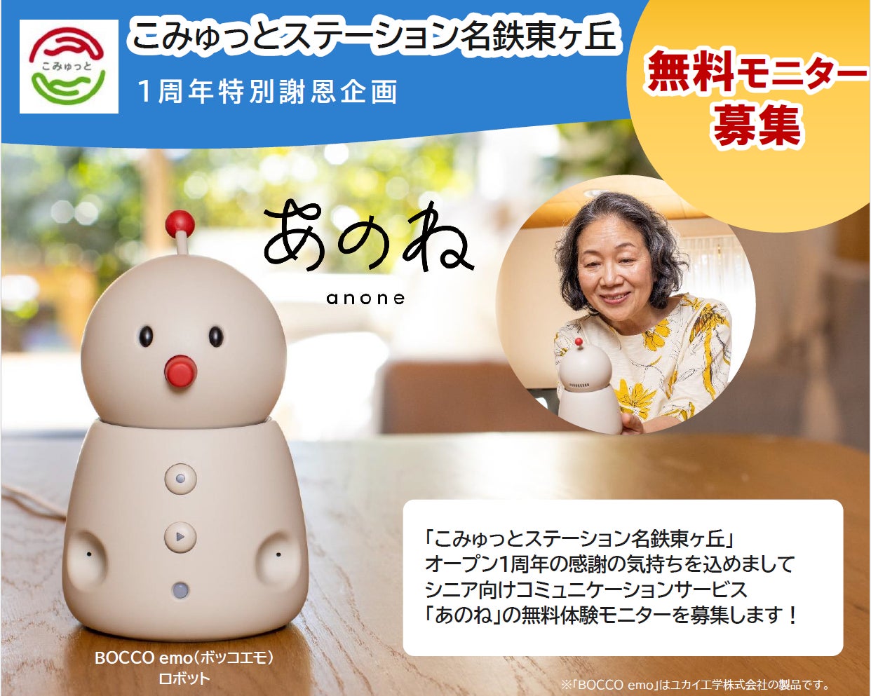 名鉄エリアパートナーズ株式会社(本社:名古屋市南区、代表取締役社長:林裕二)が運営する地域コミュニティスペース「こみゅっとステーション名鉄東ヶ丘」(愛知県知多郡阿久比町大字福住高根台35番地7)の利用者を対象として、ロボットを活用したシニア向けコミュニケーションサービスとお買い物支援による、地域の「元気」と「便利」をサポートする実証実験を行います。またこれに合わせて、本実証実験にご協力いただく無料モニターを募集します。
