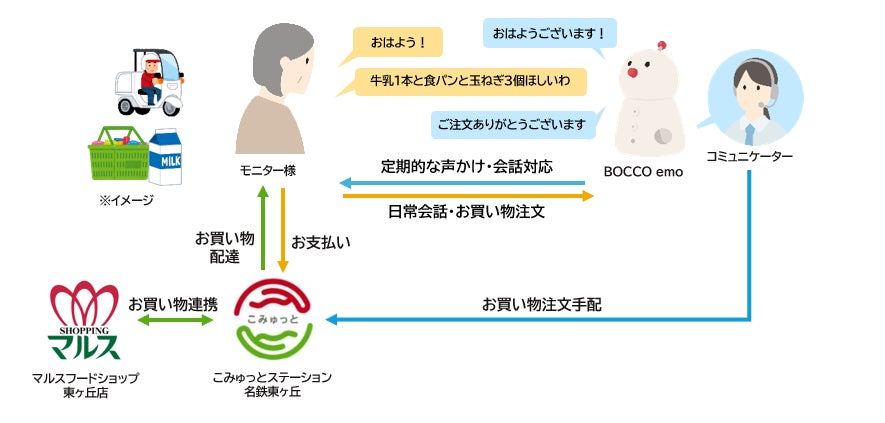 近隣の食品スーパー「マルスフードショップ東ヶ丘店」と連携し、ロボットにてお買い物のご注文をお受けし、ご注文された商品をモニター様のご自宅にお届けするサービスを体験できます。