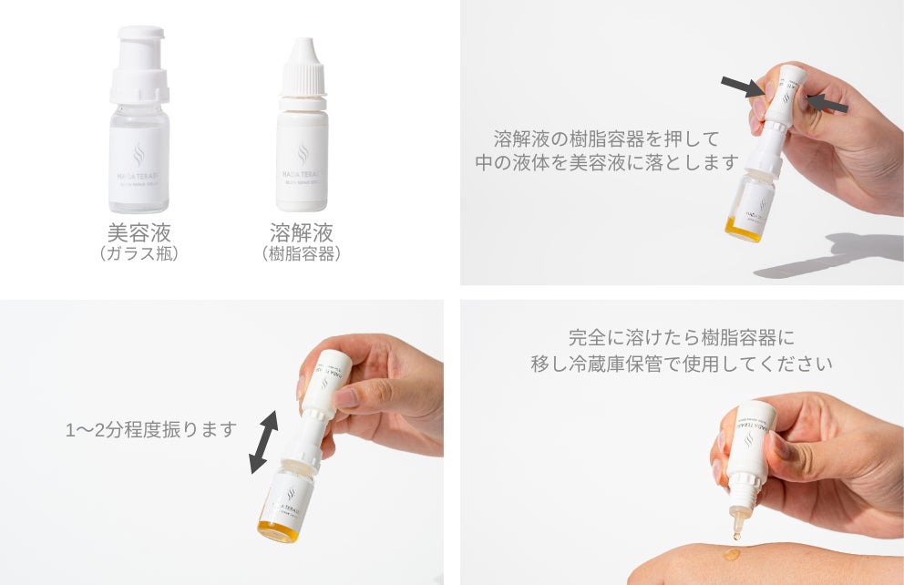 ③樹脂容器を押して中の溶解液を美容液に落とします。