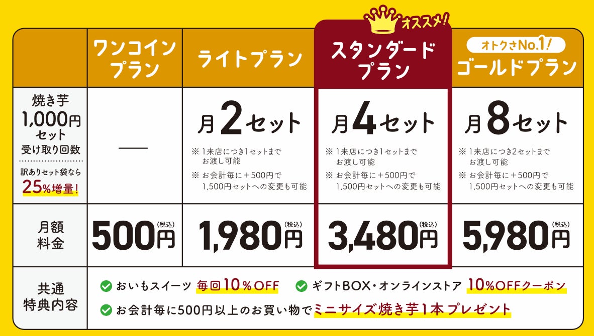 おいもをより日常の中で楽しんでもらう。スーパーやコンビニでも気軽に購入できるようにもなった中、より高品質で安定した焼き芋をプランによってはコストパフォマンス面でも負けないオトクさを実現している。