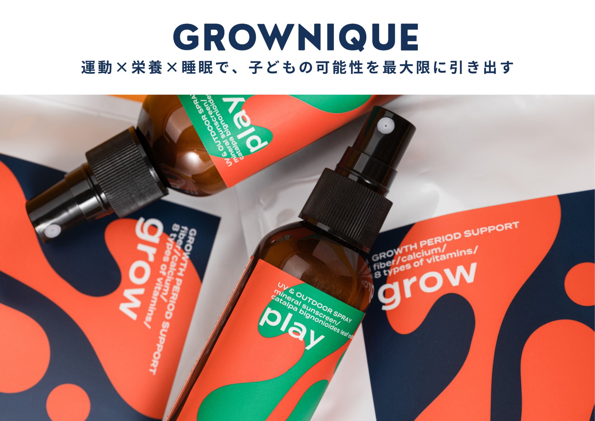 “運動×栄養×睡眠で、子どもの可能性を最大限に引き出す” をコンセプトに、UVカット剤配合アウトドアスプレー「PLAY」と日本初ぐんぐんスイッチ配合粉末栄養補助食品 「GROW」を展開
