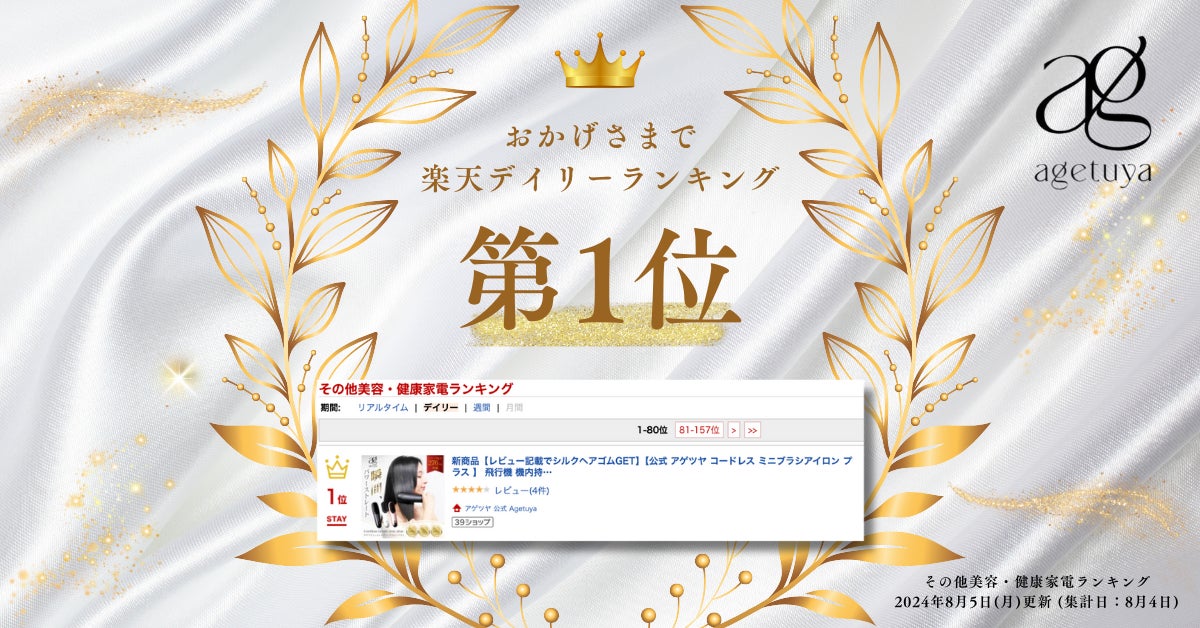 ヘアケアブランド「agetuya(アゲツヤ)」を展開する株式会社ローネジャパンは、2024年7月1日(月)より販売を開始した新商品「コードレスブラシアイロンプラス」が、2024年8月5日(月)〈集計日:2024年8月4日〉時点で、楽天市場のその他美容・健康家電ランキングにおいて、デイリー1位を獲得したことをお知らせいたします。