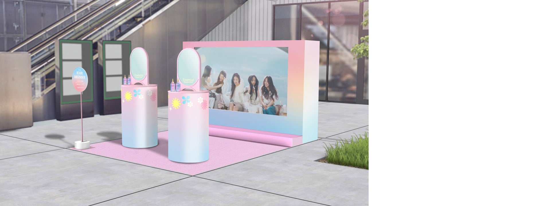 本イベントでは、エッセンシャルの広告モデルNewJeansの巨大ビジュアルがミヤシタパークのいたるところに登場。施設屋外入口シート広告や館内サイネージ、屋上スぺースなどに設置しています。また、4階芝生ひろばでは髪が舞い上がるほどの爆風が楽しめる巨大扇風機を設置。CMのNewJeansのように髪をなびかせて記念撮影ができる「爆風体験フォトコーナー」となっています。さらに、今話題の16タイプ性格診断の結果に合わせ、自分にあったヘアケア商品のサンプルセットがもらえる「16TYPE GIFT STAND」や、南2階ウェルカムテラスでは大人気の「Essential Premium」ウォータートリートメントをお試しできる「つるサラ髪体験ヘアドレッサー」など、ユニークな企画が盛りだくさんです。
