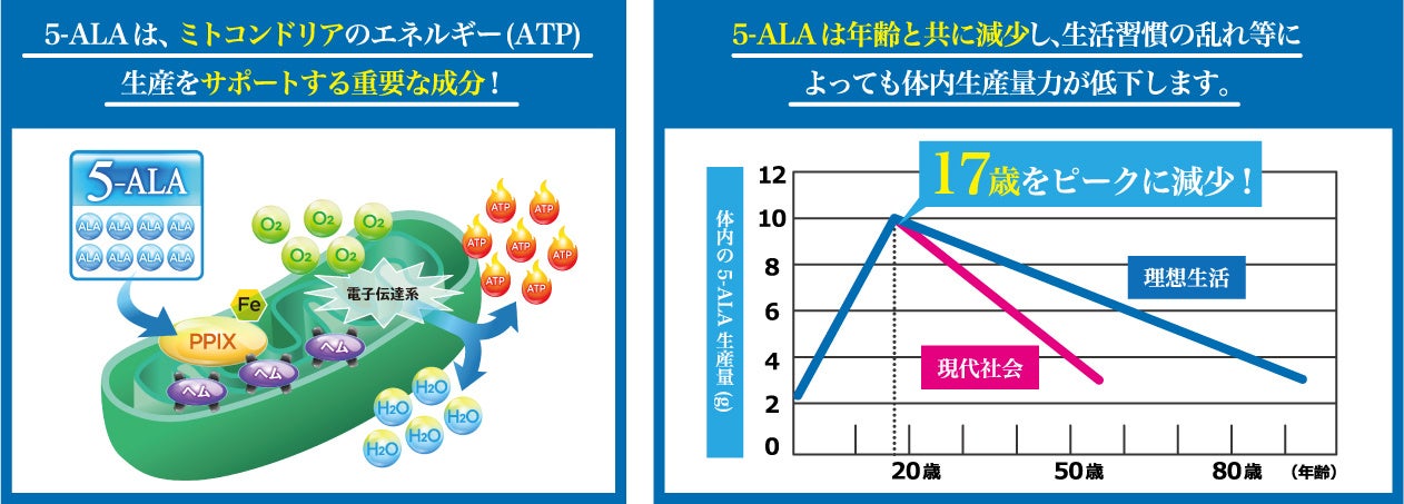 5-ALAとは、ミトコンドリアの活性化に重要な役割を果たし、私たちの元気や免疫力・活力の維持に欠かせないアミノ酸です。しかし、年齢と共に減少し食事からの摂取も難しいのが現状です。