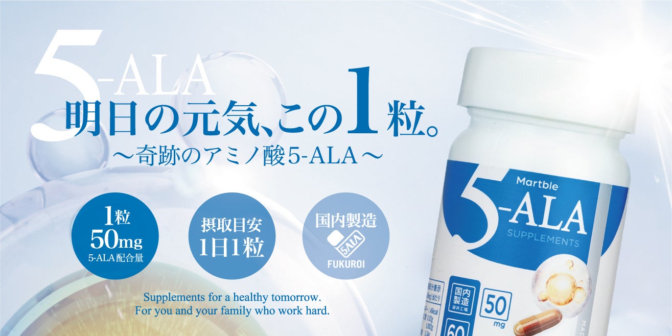 株式会社Martbleは、5-ALAサプリメントをAmazon・楽天市場にて展開いたします。オープン記念として、ボトル1本(60粒入)ご購入の方に、数量限定にてパウチ1袋(約2週間分)をプレゼント!